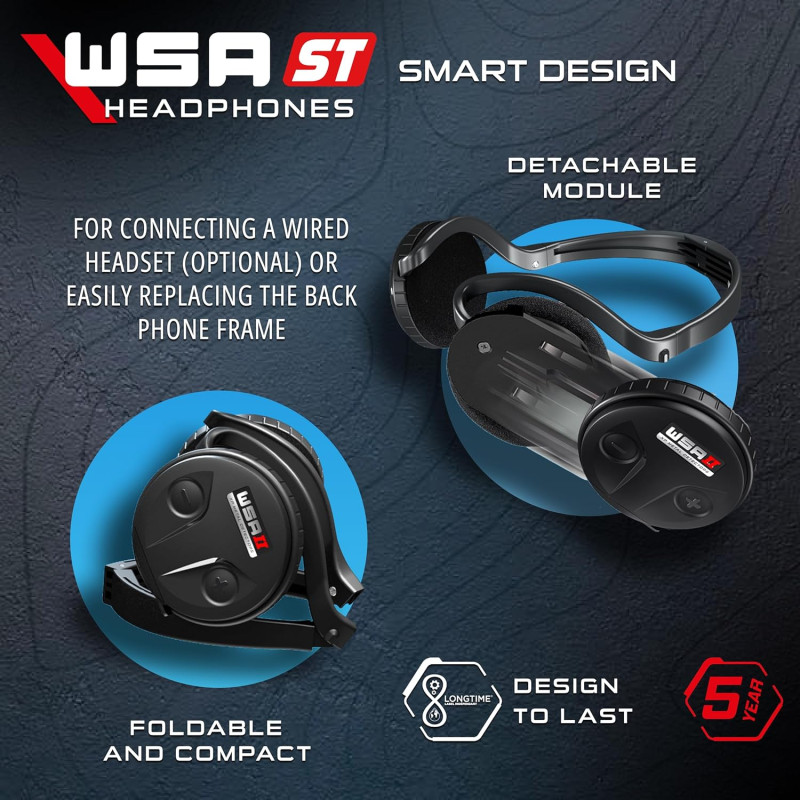 WSAST er Stereo utgaven av WSAII trådløse hodetelefonen til DEUS2. WSAST er svært lett med hodebøyle som går bak nakken slik at den enkelt kan brukes med lue eller caps. Den er regn og sprutsikker og har volumkontroll og lydequalizer. Den er utstyrt med et oppladbart batteri med opptil 27 timers driftstid og lades via USB kontakt på undersiden.